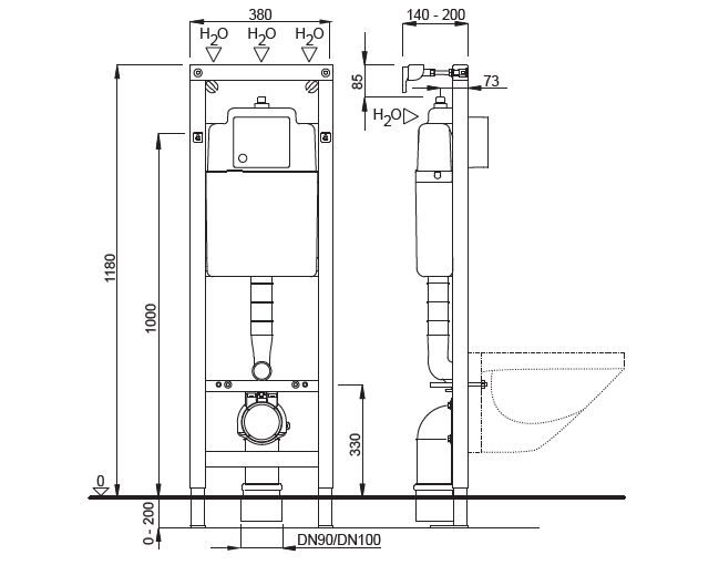 stelaż do WC wiszącego , DUPLO 380 , nowoczesna konstrukcja oparta na ramie stalowej malowanej proszkowo o szerokości 380 mm i wysokości 1180 mm ; podtynkowy system do suchej zabudowy lub w ścianach z prefabrykatów z wysuwanymi nogami montażowymi o regulowanej wysokości (0 - 200 mm ) ; zawiera zbiornik w osłonie ze spienionego polistyrenu ( osłona przeciw kondensacji pary wodnej ) , z nowoczesnym i cichym zaworem napełniającym ( klasa głośności 1 , norma ISO 3822 ) z regulacją objętości , z nowoczesnym zaworem spustowym , który posiada funkcjonalność płukania dwudzielnego ( 3 / 6 litrów ) jak i START- STOP ; doprowadzenie wody do zbiornika możliwe w 4 różnych miejscach ; w komplecie fabrycznie zamontowane wsporniki ścienne . Zawiera komplet materiałów przyłączeniowych i montażowych .