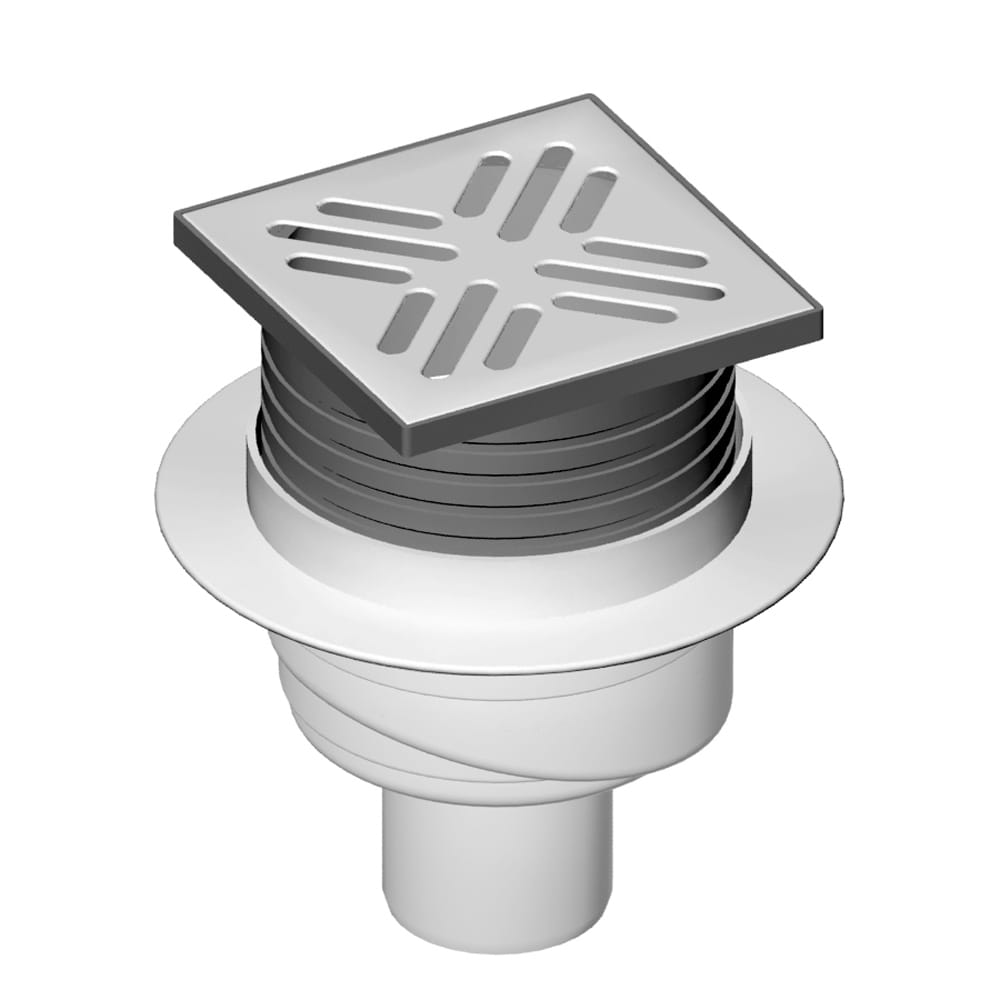 Punktowy odpływ podłogowy , odpływ pionowy DN50 , ruszt ze stali nierdzewnej 105 x 105 mm .