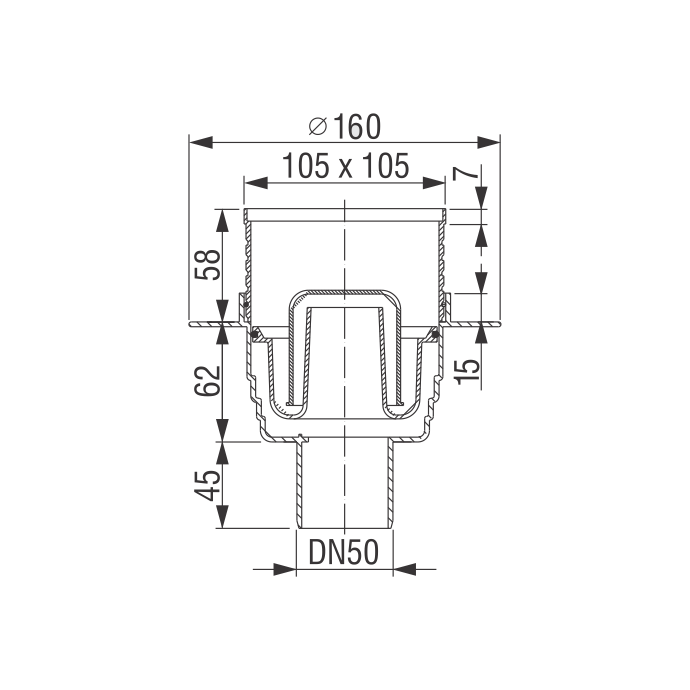 odpływ podłogowy pionowy DN50 , ruszt inox 105x105