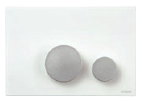 płytka FUTURA , z białego tworzywa ASA , z dwoma klawiszami funkcyjnymi z metalu w kolorze szarym , bardzo efektowne dwudzielne uruchomienie płukania 3/6 litrów do WC ; przyciski wystają z płaszczyzny płytki dzięki czemu całość ma trójwymiarową i czytelną formę . Wymiary 243 x 168 mm .