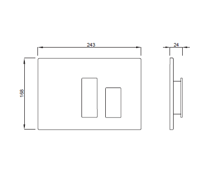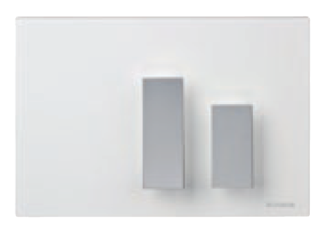 płytka GENERA , z białego tworzywa ASA , z dwoma klawiszami funkcyjnymi z metalu w kolorze szarym , bardzo efektowne dwudzielne uruchomienie płukania 3/6 litrów do WC ; przyciski wystają z płaszczyzny płytki dzięki czemu całość ma trójwymiarową i czytelną formę . Wymiary 243 x 168 mm .